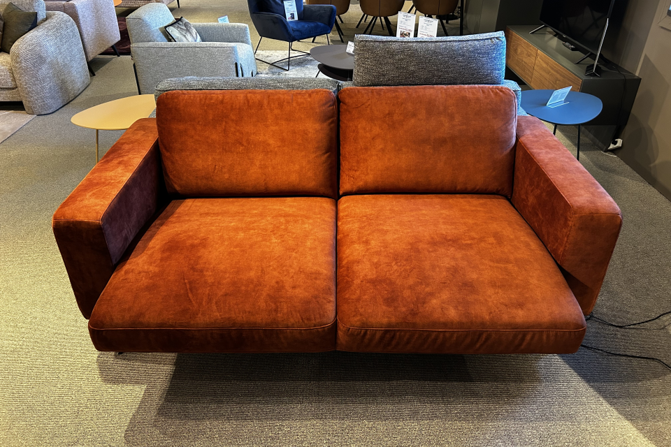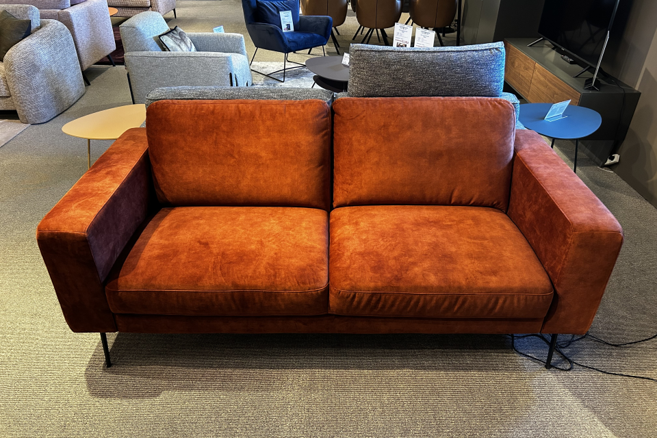 De bank is bekleed met velourstof Adore in de kleur Copper 126 en staat op zwarte poten. Dankzij de interieurvering zit de bank extra stevig en comfortabel. De zittingen kunnen elektrisch uitgeschoven worden voor een diepere zitting.