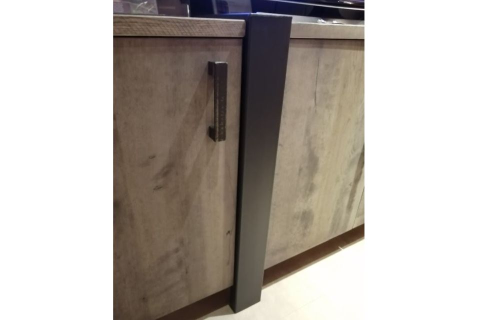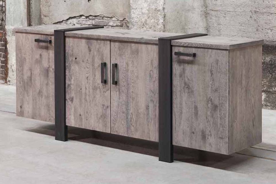 Het dressoir is uitgevoerd in rustiek eiken in de kleur VDD 011 Grey, met zwart stalen onderdelen.