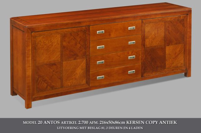 Antos dressoirs zijn zeer fraaie klassieke design meubels. De dressoirs zijn op bestelling verkrijgbaar in verschillende afmetingen. De dressoirs danken hun klassieke look aan het soort lak en de materialen die de fabrikant gebruikt. Naast dressoirs kan Antos u een collectie kasten bieden. Om de kasten van Antos te bekijken kunt u op de link klikken.
