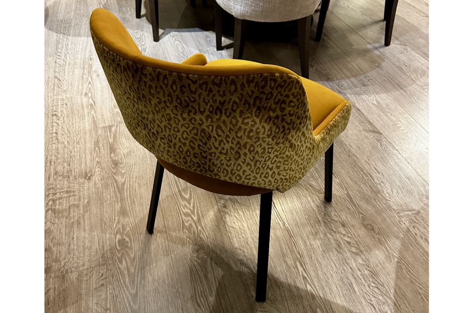 Het gaat om 1 eetkamersoel in stof Tone FR Crib 5, in de kleur Tabacco en staat op een zwarte poten.