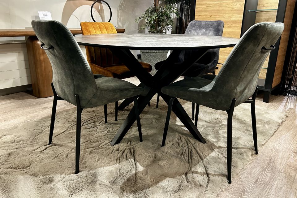 De eettafel is uitgevoerd in HPL in de kleur Grey Dark Stone. De tafel staat op een zwartmetalen spinpoot.