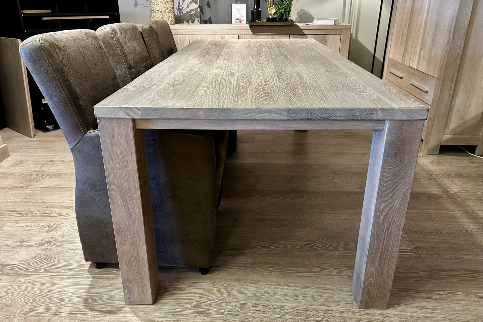 De eettafel is uitgevoerd in eikenhout in de kleur Smoked Grey Oil 151. De tafel heeft een rechte vorm en is gecombineerd met hoekpoten. Het tafelblad is geschraapt afgewerkt en de rand is afgewerkt met een slijtrand.