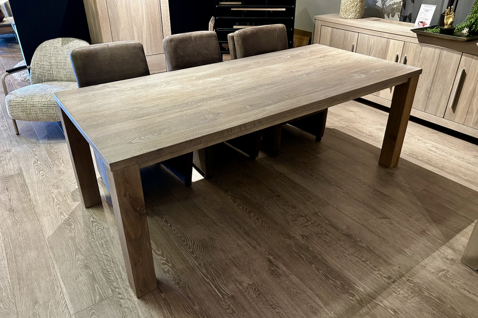 De afmetingen zijn: 220 x 100 x 77 cm (bxdxh). Het blad is 4 cm dik en de poten zijn 11 x 11 cm.
