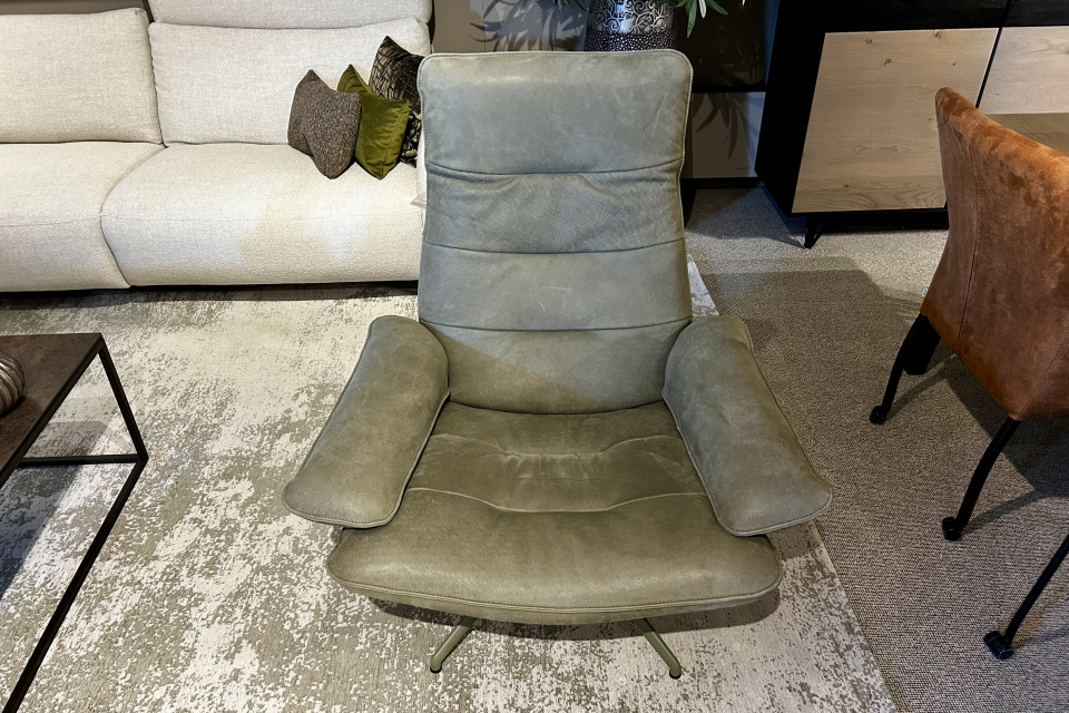 De fauteuil is bekleed met leder Toga in de kleur Olive en staat op een groene draaipoot.